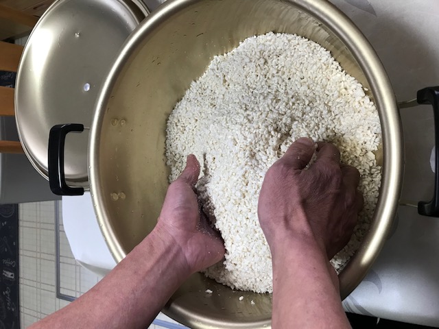 麹と塩を丁寧に揉み込みます。この作業を麹を切ると言うそうです。杜氏さんは麹を触るので麹の作用で掌がすべすべだそうですね。たしかに私の掌もそうなりました。麹入りの化粧品は人気だそうですね。納得です。
