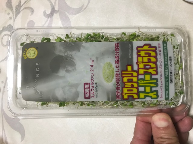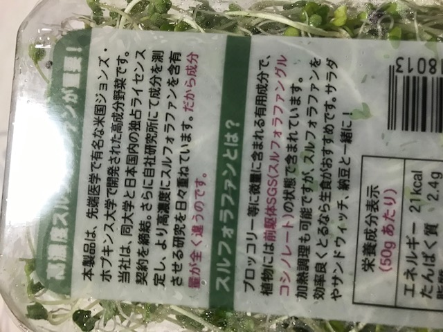 ブロッコリースプラウトは、抗酸化作用ーガン予防作用が高いとされる、スルフォラファンが高濃度に含まれる食品だそうです。スーパーのもやしの売り場にあります。ただし、ブロッコリースプラウト内には、その前駆体であるスルフォラファングルコシレートの状態で存在するそうです。前駆体から有効な成分であるスルフォラファンに変化させるには「よく噛むこと」が大切だそうです。もちろんブロッコリースプラウトに限らず、他の食品でも栄養成分を有用に体内で吸収するためには、よく噛んで細かくし、「よーく唾液と混合させて」から呑み込むことは大切です。