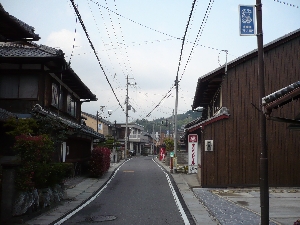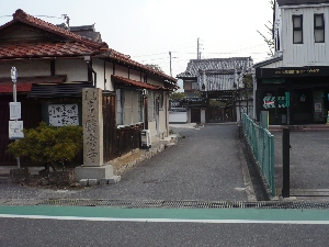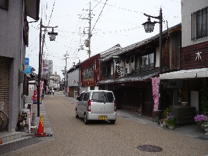 ほんのしばらく行くと草津宿出口の道標に出会います。案内板には「草津宿の江戸方の入り口でありました草津川の堤上に建つ火袋付石造道標です。総高は約3.9メートルを測り、日野の豪商中井氏の寄進によって文化十三年(1816)三月に建てられました。竿には 右金勝寺志がらき道 左東海道いせ道 とそれぞれ行き先を刻んでいます。なお、道標はかつて道を挟んで北側にありました」とあります。道標どおり左に曲がり天井川の草津川をわたる小さな橋があるのでわたります。そうすると景色は一転し、いかにも旧街道と言える古い家並みの間を旧街道そのままの幅の道が続きます。当日、朝はすっかり晴れていましたが草津宿に着く頃には曇り空、そして草津宿を出る頃には時々ぽつぽつと雨が降り出しました。うっかり雨など考えもせず、傘を持たずに家を出てきました。濡れたくないと気はあせるんですが、石部はまだ10キロ以上先です。どうなることやろー。