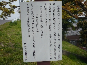 しばらく行くと、昔の街道の再現のねらいでしょう、松並木が見られます。傍の案内板には「北脇縄手と松並木」の解説がしてあります。「東海道が、一直線に伸びるこの辺りは、江戸時代「北脇縄手」と呼ばれた。縄手(畷)とは田の中の道のことで、東海道の整備にともない曲がりくねっていた旧伊勢大路を廃し、見通しのよい道路としたことにちなむと考えられる。江戸時代、東海道の両側は土手になり松並木があった。街道は近隣の村々に掃除場所が割り当てられ、美しさが保たれていた。・・・」と書かれています。