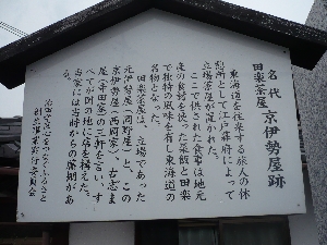 民家に大きな石碑が目立ちます。「京伊勢屋跡」だそうです。立て札には「名代 田楽茶屋 京伊勢屋跡 東海道を往来する旅人の休憩所として江戸幕府によって立場茶屋が置かれた。ここで供された食事は地元産の食材を使った菜飯と田楽で独特の風味を有し東海道の名物となった。・・・」と記されています。当時のものはどんなものか分かりませんが、「菜飯と田楽」織田は好きです。お腹も減って空模様も怪しくなって先を急ぎました。