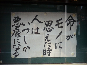 西福寺前通過。「命がモノに思えた時 人はいつしか悪魔になる」と書かれたいます。「いつしか」は・・いらないうに思えます。