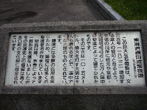 「東海道横田渡常夜燈 この巨大な石灯籠は、文政五年(1822)増加する旅人の目印になるよう、東岸の川岸に地元や京都・大坂を中心とした万人講中の寄進によって建てられたものです。その高さは10.5メートル、燈火を灯す火袋は大人も通れるほどで、道中でも最大級のものとされています。・・・」記されています。